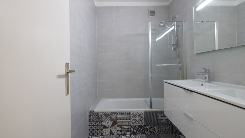Het appartement beschikt over twee volwaardige slaapkamers, elk met een aangename sfeer en voldoende ruimte voor een dubbel bed en opbergmogelijkheden. De badkamer is functioneel ingericht met een lavabo en bad.
