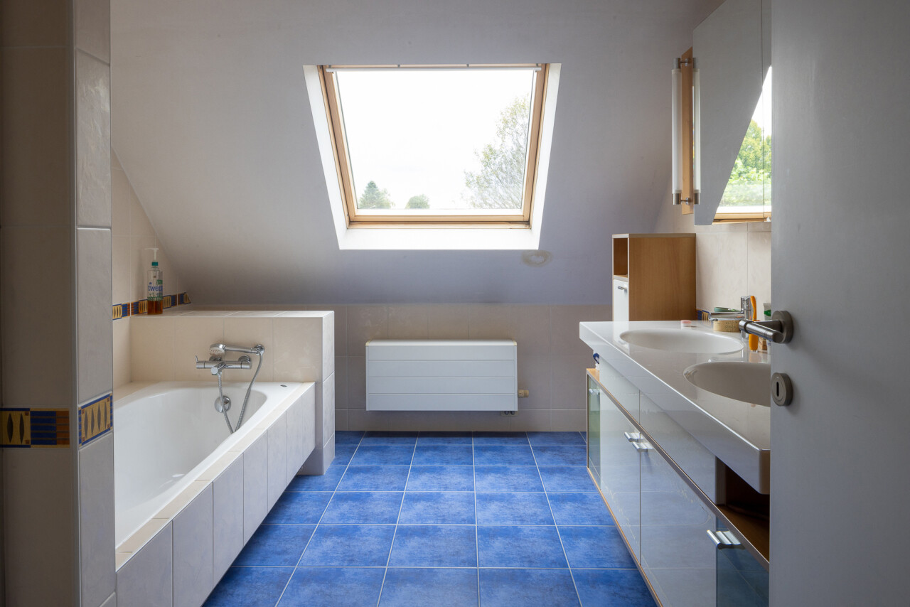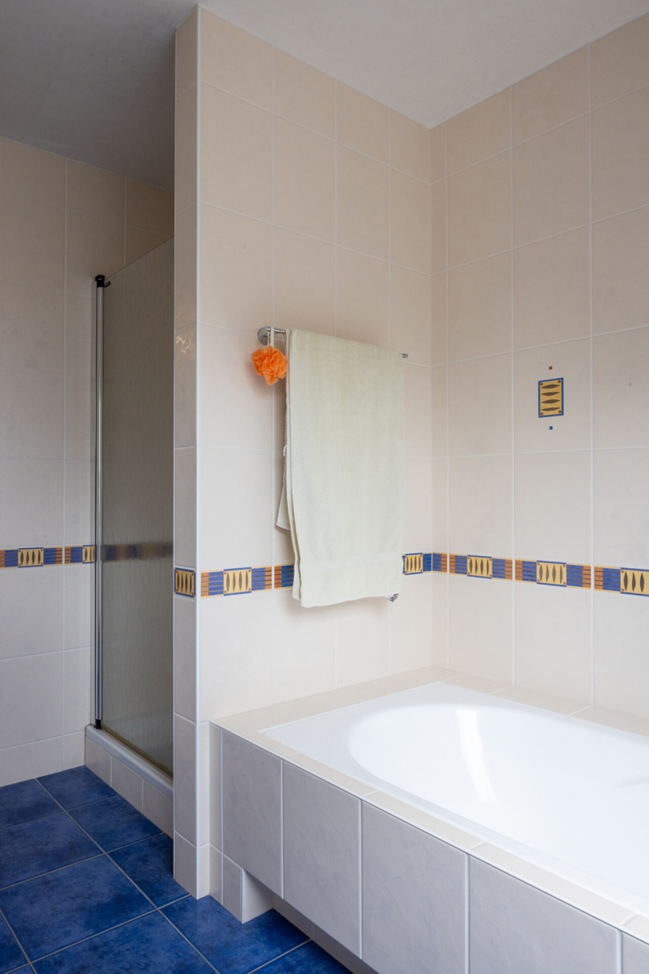 Op de eerste verdieping bevinden zich drie slaapkamers, waaronder een master bedroom met dressing en eigen badkamer voorzien van dubbele lavabo, bad, douche en toilet. Daarnaast is er nog een aparte douchekamer en een afzonderlijk toilet, ideaal voor gezinnen of gasten.